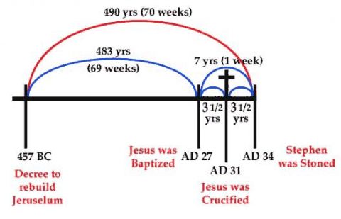 Seventy prophetic weeks equal 490 prophetic days or years. If you add 490 years to 457BC we reach 34AD (adding 1 because there is no year zero in the BC/AD calendar). But what happened in 34AD? Three and a half years after Jesus died and rose? Acts 7:58 says Saul / Paul stoned the prophet Stephen to death. Galatians 1:18 says Paul says the first visit to Jerusalem came three years after his conversion. Galatians 2:1 says the second visit occurred fourteen years after the first visit. Acts 18:12 says right after Paul left Jerusalem after the second visit he went on a missionary journey to Corinth where he appeared before the proconsul Gallio. From an archaeological inscription found in Corinth, historians know Gallio’s one-year proconsulship occurred in AD51. If you subtract 17 years from 51, you reach 34AD - the estimated death of Stephen's stoning.
